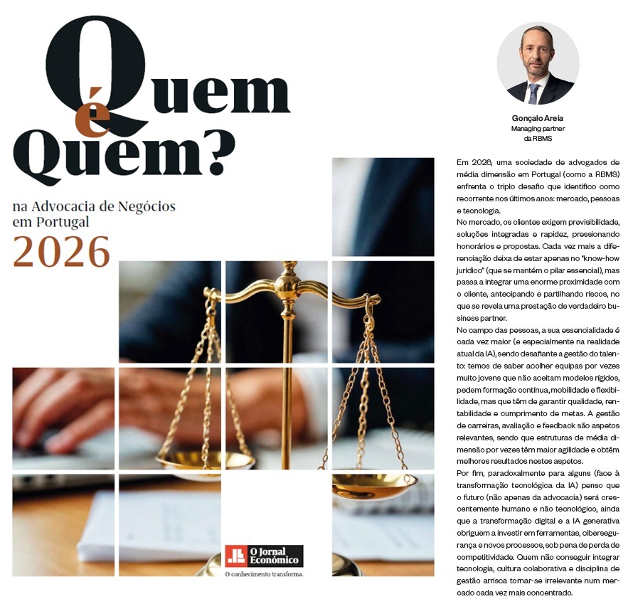 O Sócio e Managing Partner da RBMS, Gonçalo Areia, integra o “Fórum de Decisores” do anuário Quem é Quem na Advocacia de Negócios em Portugal 2026, publicação do Jornal Económico.